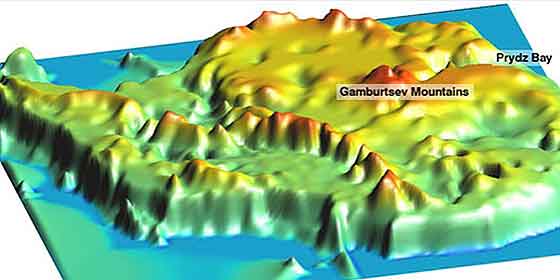El accidente geográfico de Gamburtsev, origen físico de la glaciación del continente, se expande por una longitud de 1.200 kilómetros y comprende en su interior numerosos valles y llanuras, sepultados también por hielo.