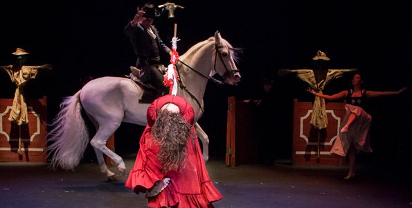 El caballo es la atracción, pero sus supuestas memorias no pasan de una insistente, reiterativa y vulgar referencia al toreo, al más tópico de los referentes andaluces en una obra que proclama huir de ellos. Presidida por una de esas cabezas horribles de astado que se disecaban para ser expuestas en ventas y tabernas, la escena es una sucesión continua de alusiones al toro y al torero, con zapateados en traje de luces, bailaores con banderillas, y sucesivos personajes con astas embistiendo a troche y moche, todo ello adornado con pasodobles a todo volumen, acompañados de piano y guitarra atronadores y salteado por cantes sin duende.