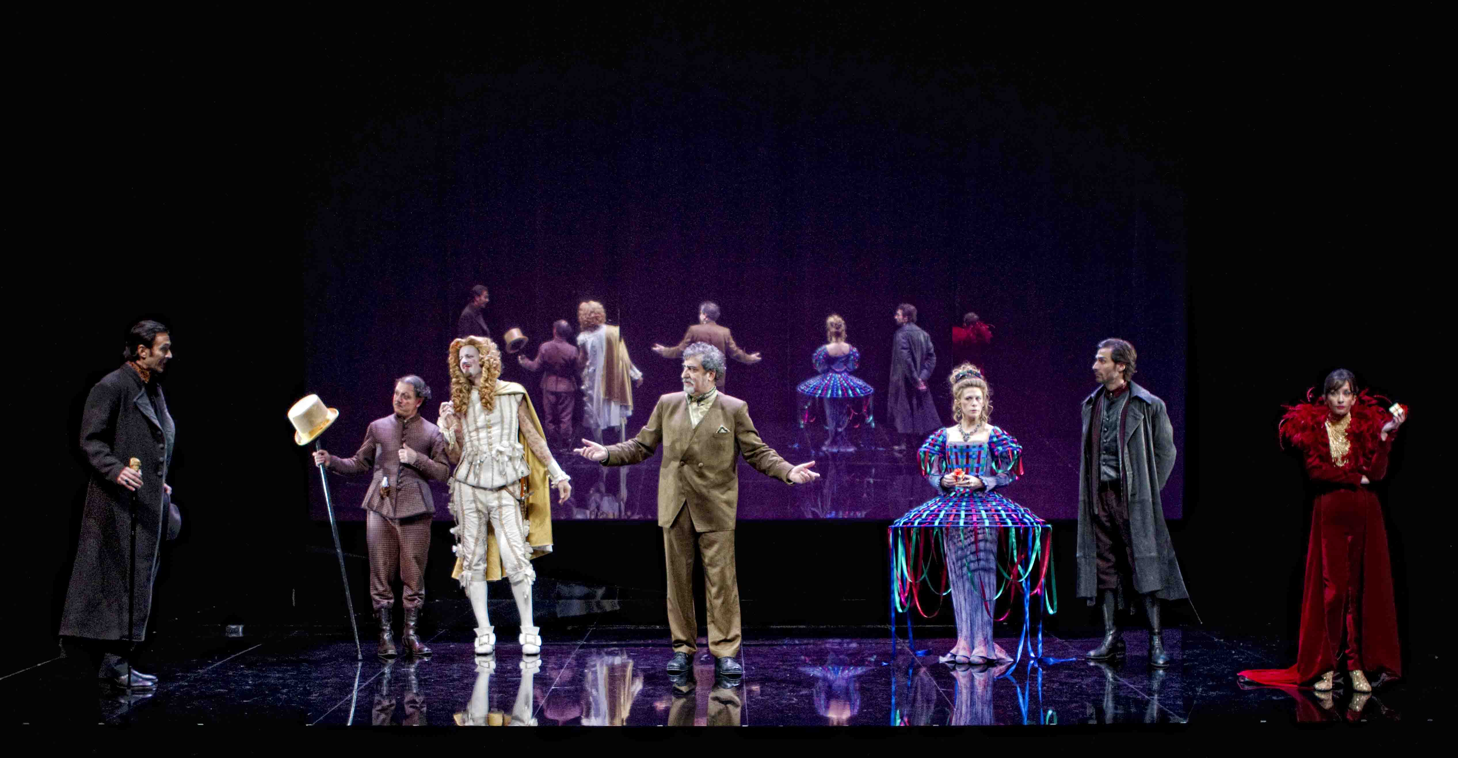 Nada que objetar a la escueta, a la par que elegante, escenografía de Paco Azorín. Hemos visto antes esos espejos y esos marcos que pueblan el escenario de ilusiones y alusiones, pero sus alternancias espaciales aportan valor añadido. Ingenioso el sistema de niveles en escena para multiplicar la presencia de los personajes que con sus evoluciones siempre precisas en escena, hacen un mundo donde no hay nada, ni una mesa ni una silla, nada. El vestuario tiene aciertos como el conjunto ferolítico de Inés aunque algunos varones, Don Tello especialmente, van al aire de Zara. Lástima que la trabajada música al no ser interpretada en directo como es marca de la casa en el Teatro Pavón, quede un tanto marginal y marginada, y que resulte también invisible el músico que hace intervenciones en directo. Aquí el director nos ha fallado, porque el compositor Pablo Salinas se ha empleado a fondo: una sección de cuerda con instrumentos de época, completada con clavicémbalo y contratenor para terminar. Además ‘para retratar la psicología de los personajes hemos incluido armónica de cristal y campanas de vidrio con mazas de fieltro y arco. También hemos usado la guitarra eléctrica, e incluso un Orchestrion, autómata musical de comienzos del siglo pasado muy común en los tiovivos y que nos evoca al órgano de teatro de variedades, y al cine mudo.