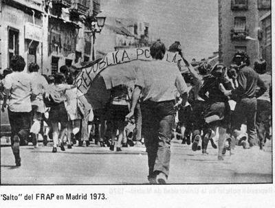 A mediados de los años 60 había rebrotado la lucha contra el régimen de Franco, a pesar de que el desarrollo económico y social contentaba ya a muchos. En este combate desigual, destacaron fugazmente unas siglas: FRAP. El Frente Revolucionario Antifascista y Patriota pretendía acabar con la Dictadura por la fuerza. Partidario de una república popular y federativa, el FRAP se lanzó a la lucha armada cuando toda la oposición se preparaba para un cambio pacífico. Su radicalismo casi suicida fue un fracaso. Gran parte de sus militantes fueron detenidos, muchos sufrieron malos tratos y terminaron en prisión, y tres de ellos murieron fusilados dos meses antes de morir Franco. A pesar de todo, el gesto del FRAP no fue inútil, y el fuerte rechazo a las ejecuciones contribuyó a aislar al Régimen y evitar que se prolongara un franquismo sin Franco, propiciando una transición pactada.