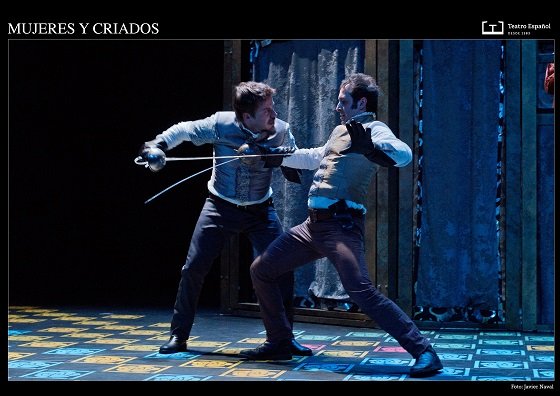Representar con nuevos brillos esta joya añeja ha corrido a cargo de no uno sino dos directores. El actor Rodrigo Arribas, después de varias experiencias como ayudante de dirección, llega ahora a este puesto de la mano veterana del británico hispanista Laurence Boswell. Ambos son responsables de un montaje que funciona, apoyado en una escenografía sencilla (basada únicamente en un pequeño tinglado articulado en el centro del vacío escenario), un vestuario ecléctico y colorista, y una caracterización que busca hacer gracia. La iluminación es francamente original, con un uso notable de los focos altos que desde la vertical y el fondo de la platea producen efectos interesantes. Funcionan los detalles musicales y el combate de espadachines es de los más efectistas que hemos visto en tantas y tantas comedias de capa y espada.