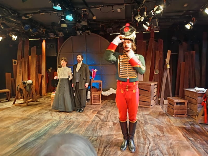 Sorprende y mucho que ambos actores sean los que permitan con sus entradas y salidas de escena e interpretaciones, salvar al público del embrollo de los espadistas en la obra, y ello gracias a la pericia de Emilio y Javier de su creación y estructura e incluso en la capacidad de ofrecer en escena un paisaje de Moscú en pleno invierno con una capa de nieve, haciendo simplemente subir por encima del piano y del atrezo una extensa sábana blanca en la que, en sus perfiles inferiores, ambos duelistas, se arrastras por esa nieve dando muestra del ejercito derrotado y el fracaso de Napoleón en su invasión a Rusia. Igualmente, el fondo del escenario, reproduce según el año y lugares en los que tiene lugar la acción, con fotografías y escenas del momento que trascurre en el escenario.