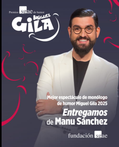 El espectáculo Entregamos del presentador y cómico Manu Sánchez ha sido designado por unanimidad como el Mejor espectáculo de monólogo de humor Premio SGAE Miguel Gila 2025. “Estoy tremendamente feliz y muy orgulloso por el equipo, el proceso y el público que está llenando cada teatro. Es un regalazo”, explica al recibirlo. “Sin lugar a dudas, el espíritu de Miguel Gila ha estado presente en toda la confección de Entregamos. Él es un referente, el espejo en el que nos miramos todos los comediantes”.