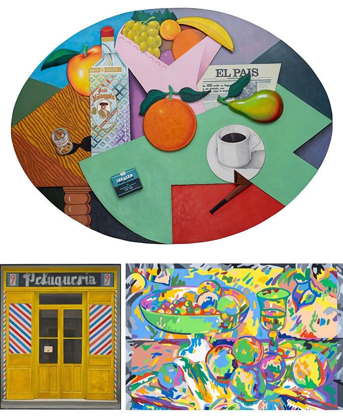 En la gran sala principal están presentes la serie Cèzanne pétit-point, con diversas reinterpretaciones del clásico bodegón de Cèzanne, o la serie dedicada a naturalezas muertas en la que coexisten obras más clásicas con creaciones más abstractas e, incluso, algunas con relieve, con las que explora lo doméstico y lo banal a través de composiciones tan precisas como evocadoras. Ambas series serían fundamentales en su trayectoria. Y en la balconada de la primera planta algunas cosas sobre su viaje a Roma y muchas fachadas, escaparates y detalles de comercios madrileños, motivo recurrente en su obra en los años setenta y curiosamente también en otros pintores de la época como Amalia Avia, así como obras en las que dialoga con otros artistas y un curioso audiovisual sobre la no menis curiosa historia del altar que instaló en 1970 en el Museo de Arte Contemporáneo Vicente Aguilera Cerni (Villafamés, Castellón) y que se ha convertido en un altar de verdad en el que la gente ora y deja testimonios.