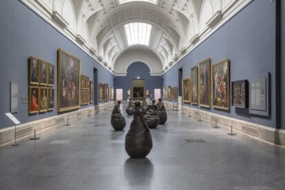 La exposición por un lado reúne en dos salas trabajos suyos muy variados, desde instalaciones a esculturas, dibujos y grabados, incluso parte de su nutrida biblioteca artística. Incluye algunas de sus piezas más celebradas, como ‘The Prompter’, ‘Conversation Piece’ o ‘The Nature of Visual Illusion’, tratando de proponer al visitante un contacto muy directo con figuras silenciosas que parecen observarle desde otra dimensión. Pero además, a ese conjunto de obras se añaden incursiones de gran audacia en la exposición permanente (sala 12/Velázquez y sala 28/Rubens), así como en espacios colaterales, la escalera sur próxima a la entrada de Murillo o la explanada de la puerta de Goya.