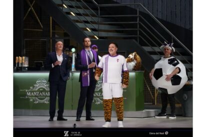 El resultado es una contradicción insalvable: lo que ves es estruendoso -porque a veces ocurre que la visión retumba- y deforma lo que oyes, máximo cuando está embutido en frases cotidianas y una música que no termina de cuajar. la dirección musical de Álvaro de Albiach no consigue en nuestra humilde opinión comprender las formas operísticas de esencia española que Barbieri consigue fundir en un todo que fue ejemplo hace siglo y medio, pero que no cuajó ante la oposición de las élites copionas del extranjero y el pueblo de cerril idiosincrasia. La orquesta divaga, los cantantes se pierden, especialmente en los conjuntos vocales, y solo los coros funcionan, más como masa actoral que con claridad acústica. Todo ello con un inicio de función francamente deplorable