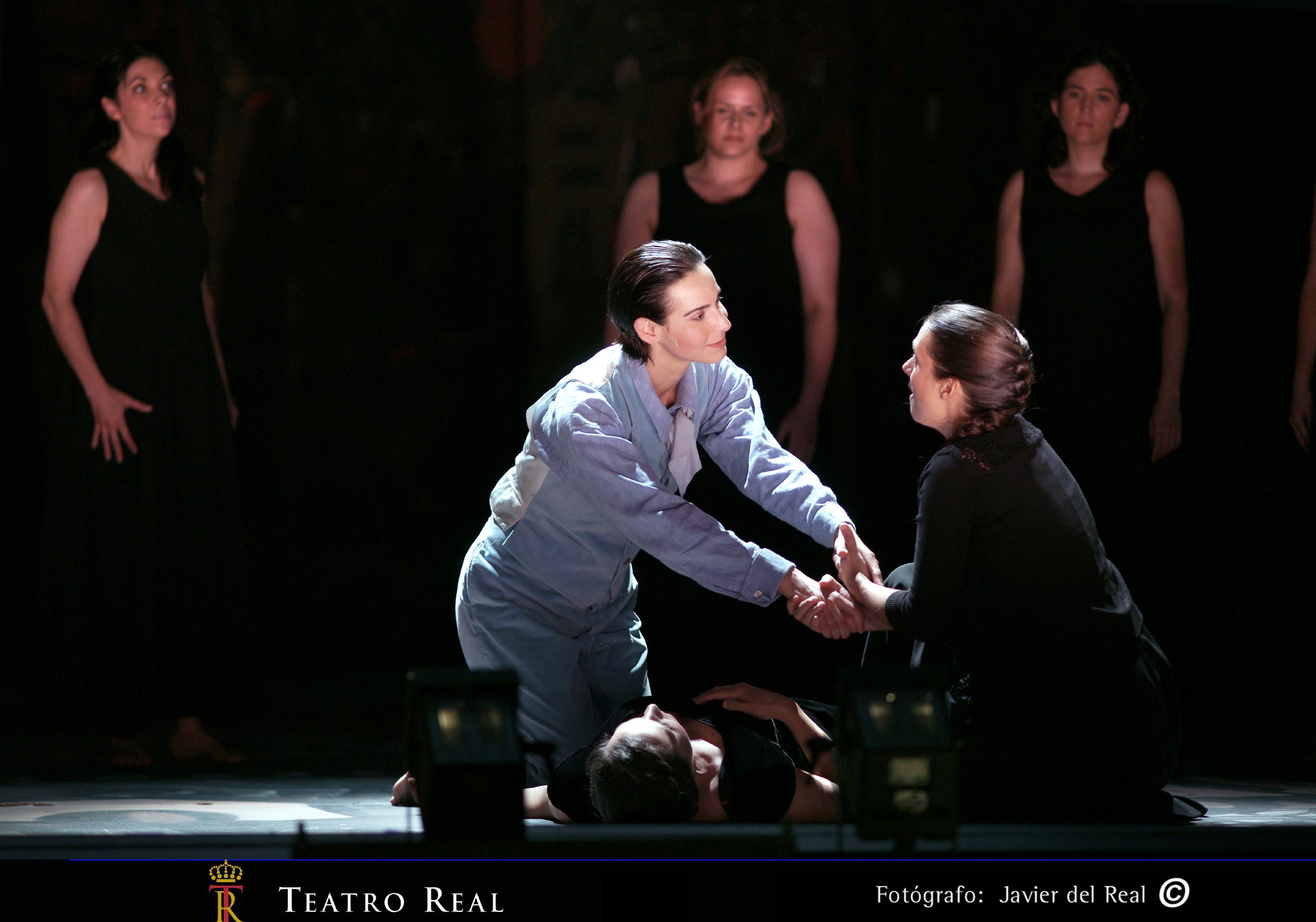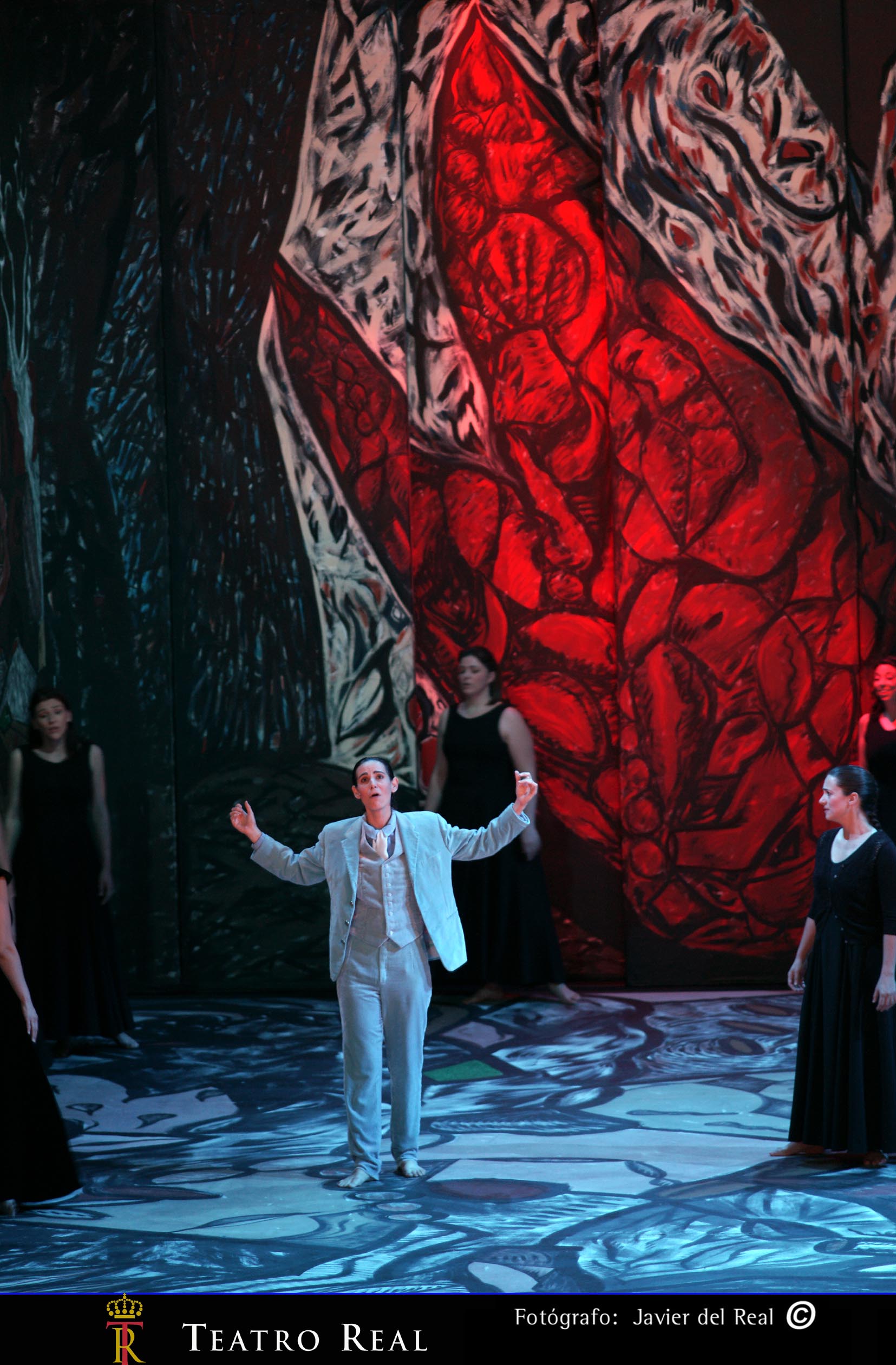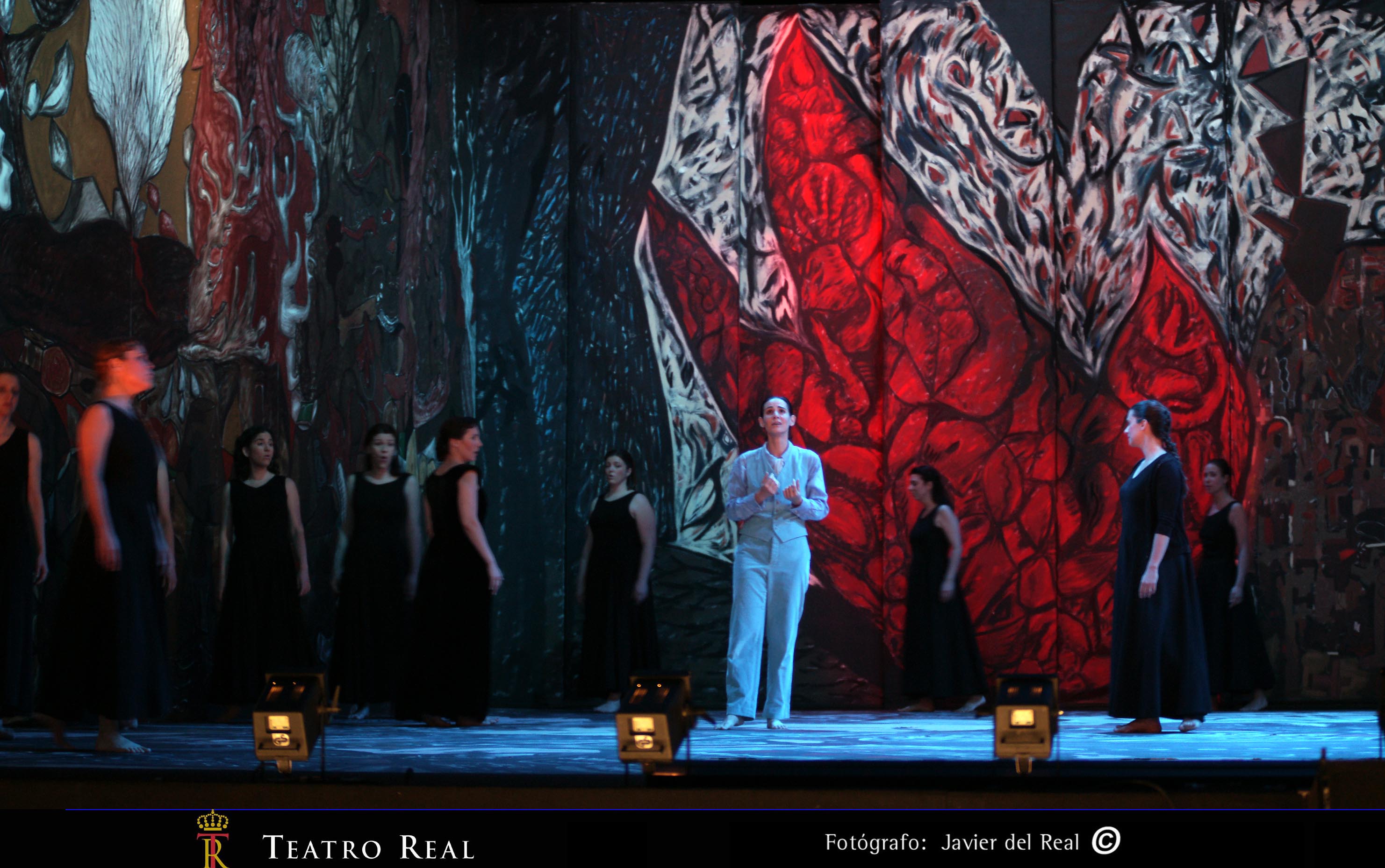 El director artístico Peter Sellars, tras su primer trabajo para el Real, ‘Iolanta y Perséphone’ en esta misma temporada, no se complica la tarea y recurre a tres paneles del artista chicano arte chicano Gronk (Glugio Nicandro) como toda escenografía, una silla desde la que Espert domina la trama, y un coro de mujeres enlutadas al estilo de la tragedia clásica griega que reconvierte al original de niñas. Los personajes recurren excesivamente a manosearse y retozar por los suelos. Las dos mujeres que interpretan a los personajes femeninos visten y peinan de manera similar lo dificulta junto a sus texturas vocales distinguirlas. La coreografía es aceptable aunque las intervenciones del bailaor no están a la altura de un público medianamente entendido. El bestialismo post-azteca de los paneles, los lamentos del coro, los espasmos del bailaor y la negrura reinante componen un escenario tétrico. Hay sin embargo un bello detalle final que aunque ya hemos visto a otros escenógrafos no deja de tener impacto: el telón de fondo se levanta descubriendo los ventanales del teatro a través de los que se ve la vida discurrir fuera, autobuses turísticos y gente en las terrazas.