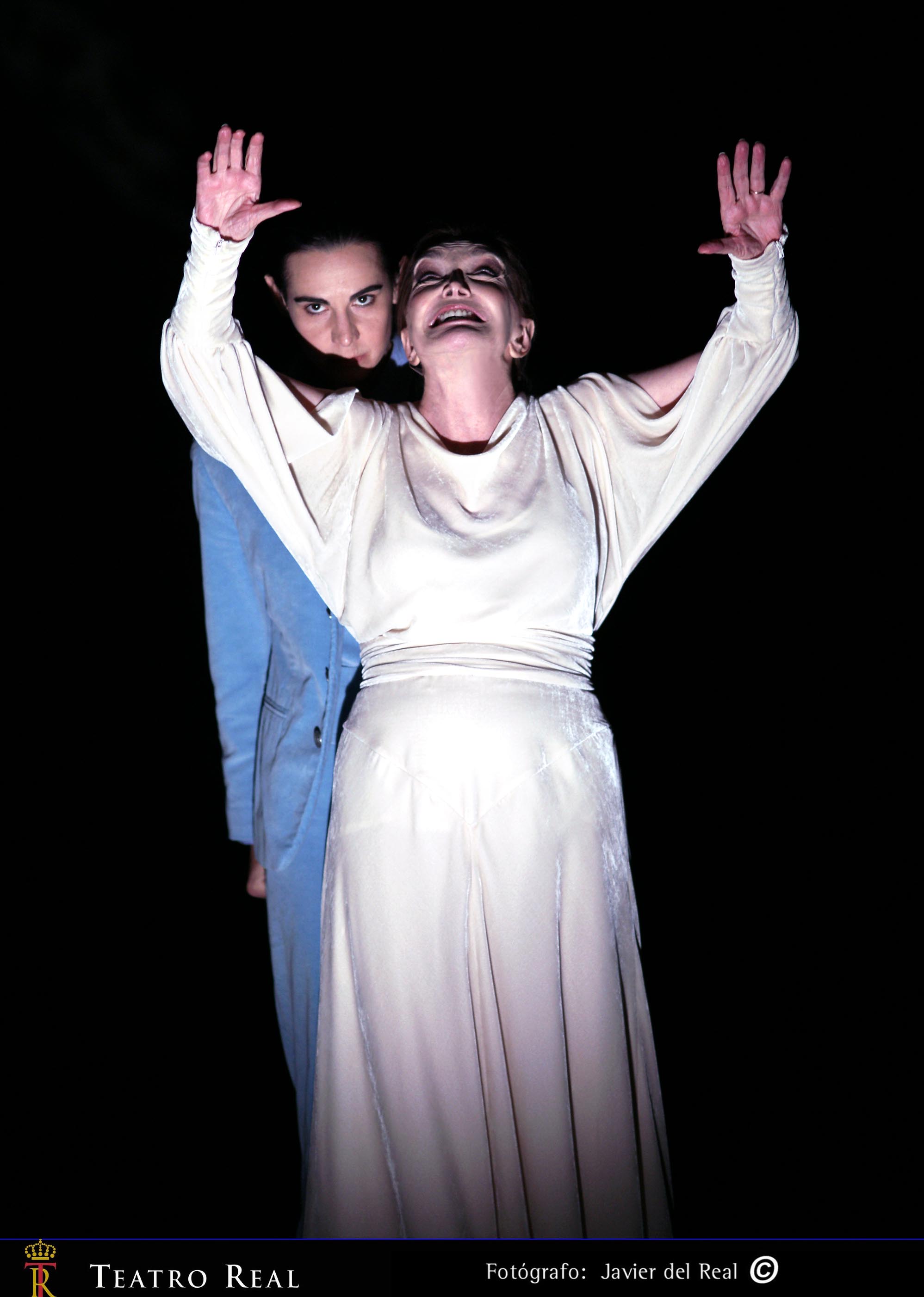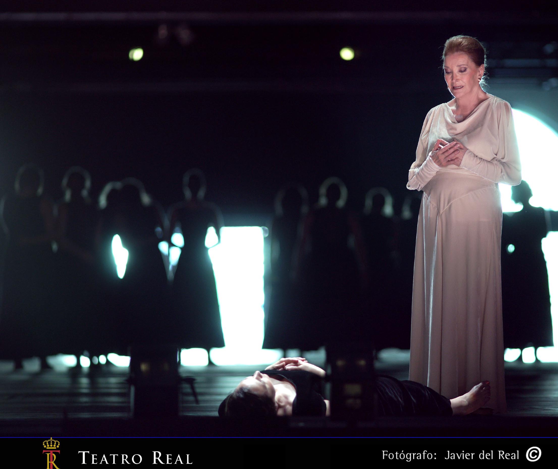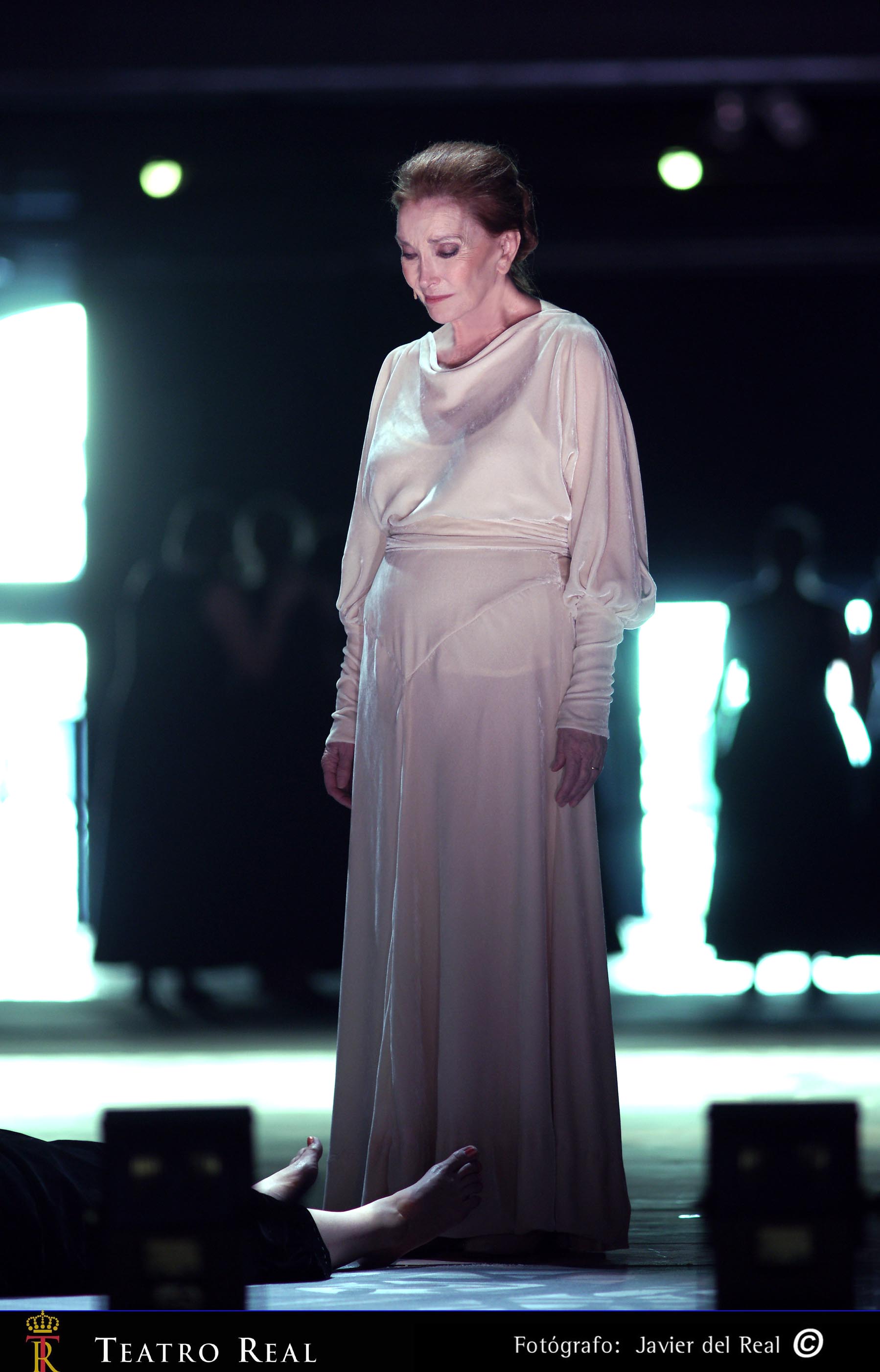 El director artístico Peter Sellars, tras su primer trabajo para el Real, ‘Iolanta y Perséphone’ en esta misma temporada, no se complica la tarea y recurre a tres paneles del artista chicano arte chicano Gronk (Glugio Nicandro) como toda escenografía, una silla desde la que Espert domina la trama, y un coro de mujeres enlutadas al estilo de la tragedia clásica griega que reconvierte al original de niñas. Los personajes recurren excesivamente a manosearse y retozar por los suelos. Las dos mujeres que interpretan a los personajes femeninos visten y peinan de manera similar lo dificulta junto a sus texturas vocales distinguirlas. La coreografía es aceptable aunque las intervenciones del bailaor no están a la altura de un público medianamente entendido. El bestialismo post-azteca de los paneles, los lamentos del coro, los espasmos del bailaor y la negrura reinante componen un escenario tétrico. Hay sin embargo un bello detalle final que aunque ya hemos visto a otros escenógrafos no deja de tener impacto: el telón de fondo se levanta descubriendo los ventanales del teatro a través de los que se ve la vida discurrir fuera, autobuses turísticos y gente en las terrazas.