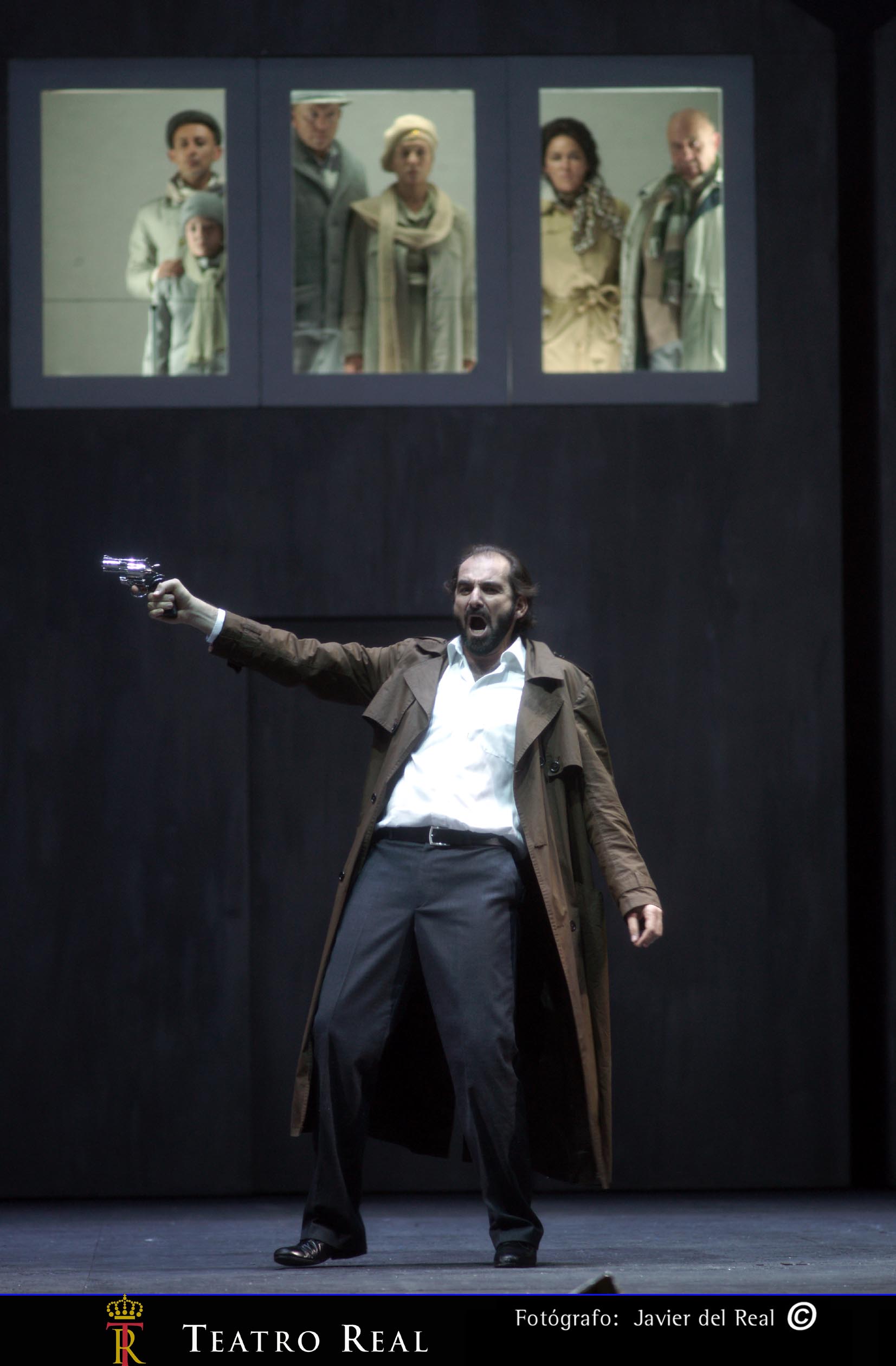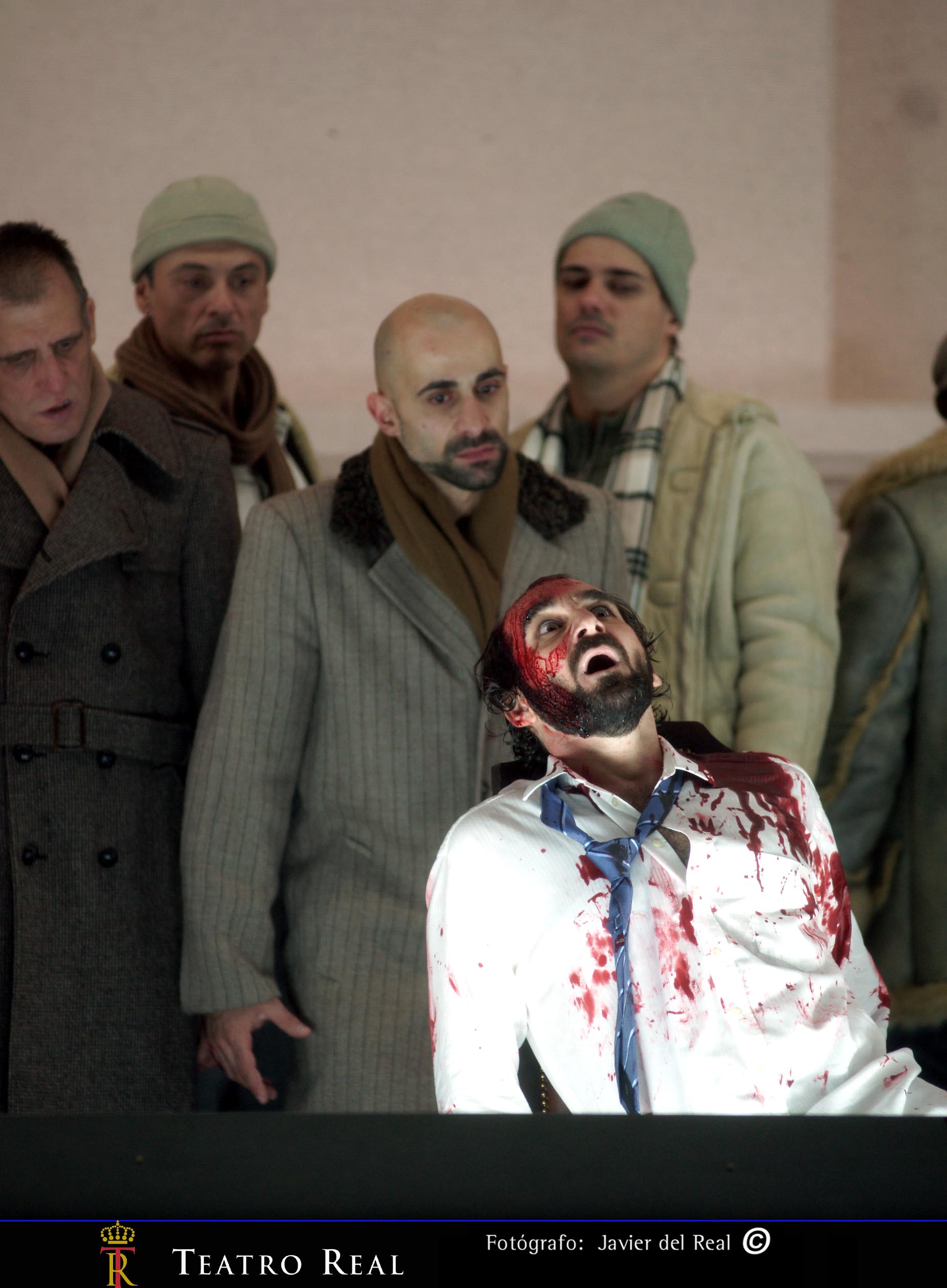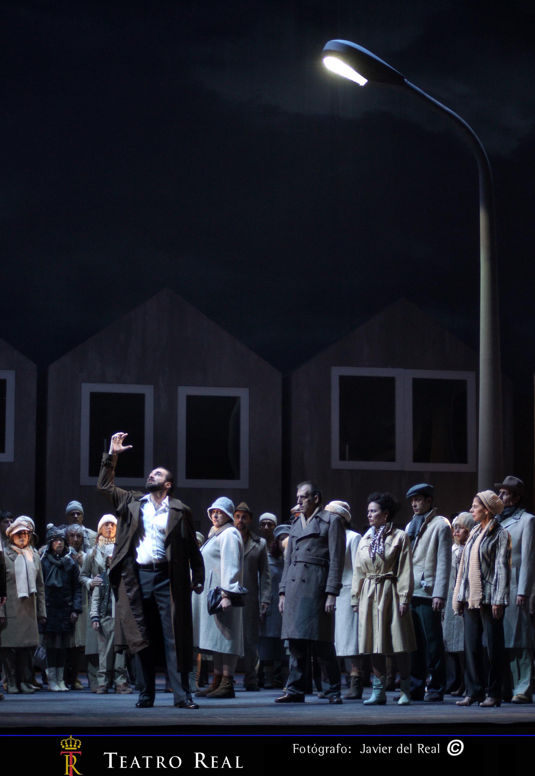 Desafortunadamente, la puesta en escena vuelve a ser discutible, como parece ya norma en el Teatro Real de los últimos tiempos. El joven ruso Dmitri Tcherniakov es el responsable de la dirección de escena, escenografía y figurines. Convierte el bosque umbrío en plaza de un poblado, y a las brujas adivinas en sus habitantes, una inquietante masa unánime, un coro adulador, criminal y vengativo, cómplice de la ascensión del tirano y herramienta de su derrocamiento. El castillo del usurpador del trono es una mansión burguesa y toda la trama de las obra se contempla a través de un ventanal de la misma, que reduce el espacio escénico a una cuarta parte enmarcada de negro fundido. Este pueblo perdido en el mapa, que puede ser remedo del Novosibirsk de los últimos tiempos de la Unión Soviética, adquiere universalidad gracias a esa popular herramienta de internet que es Google Earth, cuyo zoom escudriña el lugar desde el aire dirigido por un cursor gigante que parece el dedo del destino.