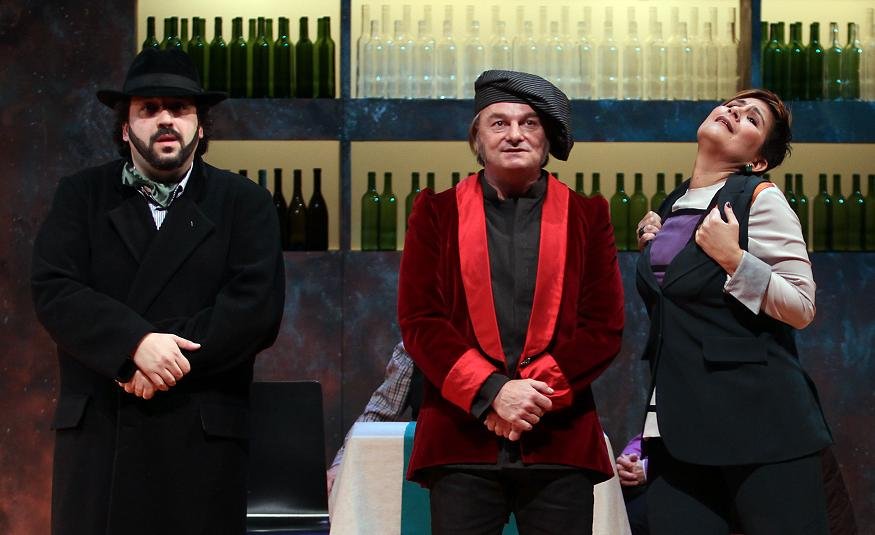 El elenco lo encabeza por edad y gobierno el barítono Luis Álvarez como dueño del restaurante, y actúa correctamente como anfitrión. Le secundan dos camareros, el gracioso -interpretado por Jesús Agelet (Els Joglars)- y el serio, que es el excelente pianista Borja Mariño que acompaña en un auténtico maratón casi todas las intervenciones vocales de las dos parejas protagonistas, la buena pro-verdiana y la mala filo-wagneriana. Cantan los cuatro excelentemente y es una lástima enorme que lo hagan con tantas interrupciones.