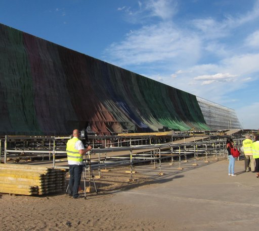 El escenario está ubicado en la zona norte del aeródromo y tiene una extensión de 195 metros de largo, 38 de fondo y 22 de altura con capacidad para albergar 2.040 personas, según ha indicado el director de producción de Cuatro Vientos, Manuel Muñoz. Además, ha señalado que, siguiendo las líneas marcadas por el arquitecto, Ignacio Vicens, se ha elaborado con espuma, tela y más de una tonelada de pintura blanca.