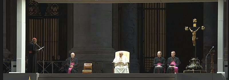Ya había anochecido cuando el Papa hizo acto de presencia en la plaza, donde le esperaban miles de familias. El espectáculo era de los que esponjan el corazón: un silencio esperanzado, acompasado por música de varios coros y la luz de las velas que, poco a poco, fueron poblando cada uno de los rincones de la mayor plaza de la Cristiandad, hasta que la oscuridad se llenó de pequeñas llamas, portadas por matrimonios, jóvenes, ancianos, niños, obispos… La Iglesia toda. Otros muchos, que no pudieron acudir, prendieron velas en las ventanas de sus casas, tal y como había pedido la Conferencia Episcopal italiana.