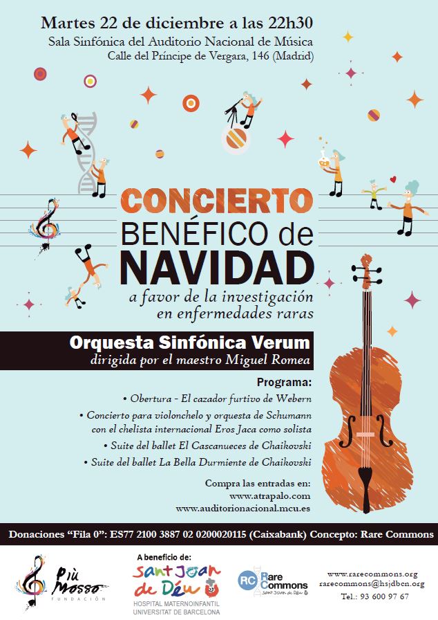 El Auditorio Nacional de Música de Madrid (Calle del Príncipe de Vergara, 146) acogerá el 22 de diciembre a partir de las 22:30h el Concierto Benéfico de Navidad a favor de la plataforma Rare Commons. El concierto, organizado con la colaboración de la Fundación Più Mosso, será interpretado por la Orquesta Sinfónica Verum bajo la dirección del maestro Miguel Romea y acompañada por el solista internacional de chelo Eros Jaca. El programa incluye obras de Weber, Shumann y Chaikovski y tiene un claro enfoque navideño.