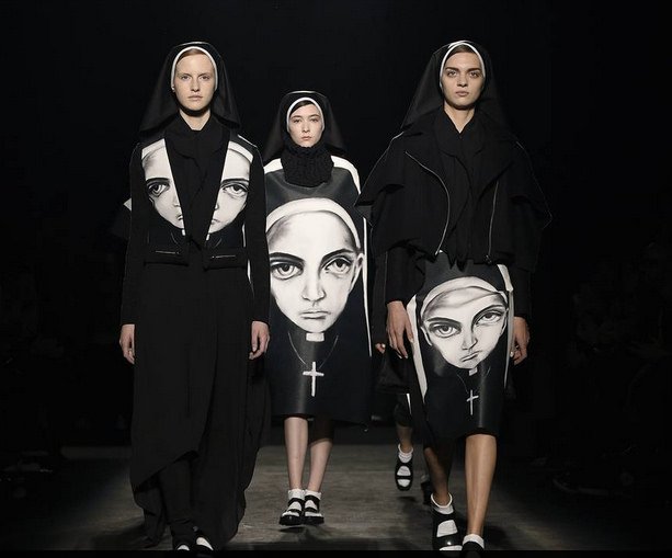 La diseñadora ha recordado que hay colecciones inspiradas en todo, pero casi nunca en monjas, y que estéticamente le gustan porque tras los hábitos, que son como uniformes, se esconden personas. En la colección tampoco ha faltado un gran estampado en algunas de las propuestas. Las modelos iban enfundadas en vestidos con rostros de religiosas de enormes ojos (un poco a lo Margaret Keane) estampados en las faldas.