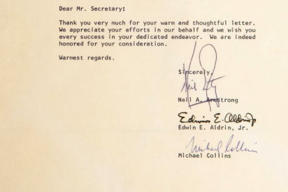 «Estimado señor secretario: muchas gracias por su cálida y considerada carta. Apreciamos mucho sus esfuerzos en nuestro nombre y le deseamos todo el éxito en su dedicada actividad. Nos sentimos honrados por su atención». La carta, en inglés, iba rubricada por Armstrong, Aldrin y Collins. Venía acompañada de la fotografía oficial, también firmada, y de una imagen del logotipo de la NASA, también rubricado por el trío. Felipe se encargaría de traducirla y escribirla a máquina, para orgullo de Pozoblanco. Una copia de la imagen y de la carta están hoy expuestas en el santuario. Los originales están a buen recaudo.