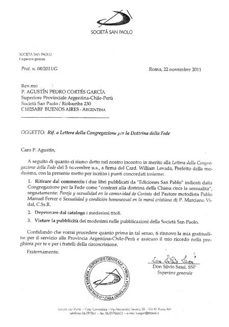 La noticia ha causado «perplejidad» en Argentina, donde el director editorial de San Pablo, Aderico Dolzani, pidió explicaciones. «No sé quién meva a dar una respuesta de por qué se tomó la decisión, pero la espero». Al parecer, la orden de retirar el libro vino después de una carta escrita por el prefecto de Doctrina de la Fe, William Levada, al superior general de San Pablo en noviembre. Junto al libro de Vidal, también se ha cancelado la venta de «Pareja y sexualidad en la comunidad de Corinto», del pastor Pablo Manuel Ferrer.