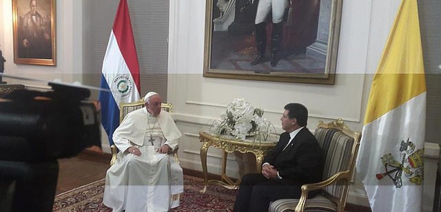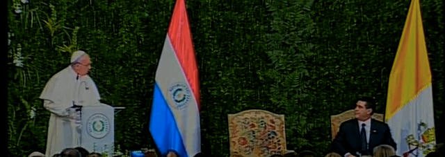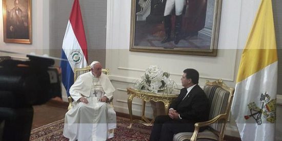 (Jesús Bastante).- Mucho más cansado -ya ha pasado casi una semana desde su salida de Roma, y muchas han sido las emociones-, el Papa Francisco se dirigió al Palacio de López, donde mantuvo un breve encuentro con el presidente Horacio Cartes, y después pronunció un discurso a las autoridades civiles y el cuerpo diplomático. A diferencia de lo ocurrido con Evo Morales o Rafael Correa, Horacio Cortes no hizo reivindicación alguna, a lo que el Papa respondió con un aval del proceso democrático iniciado en el país, «el centro del corazón de América». «Desde hace años Paraguay se está comprometiendo en un proyecto democrático y estable. Sé que existe una firme voluntad para desterrar hoy la corrupción».