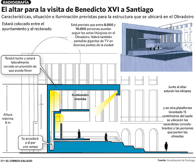 Será a su término, en torno a las 12.30, cuando abandone el aeropuerto en el papamóvil, que ya está en Galicia, en dirección a la catedral. A lo largo de un recorrido de 11 kilómetros, que debería cubrirse en media hora según el plan, Benedicto XVI saludará a los visitantes a lo largo de la carretera nacional N-634, que estará cortada entre el aeropuerto y la ciudad desde las 10.00 horas de la mañana (a partir de las 9.00, el tráfico ya estará será restringido, por lo que habrá que ir por la autovía).