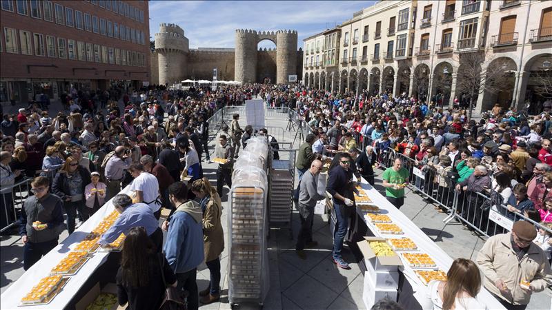 A los pies del monumento a los hombres ilustres de Ávila, la conocida «palomilla» que corona la imagen de la santa, se ha vivido uno de los momentos más coloridos de la jornada, con el reparto de 3.000 raciones de tarta, acompañadas por otras tantas tradicionales yemas.