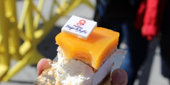 De bizcocho, limón, nata, yema y almíbar con ron, pero no apta para celíacos, ocho personas han estado trabajando desde ayer en la elaboración de la tarta del cumpleaños y han sido las encargadas de su distribución, haciendo frente a dos colas que atravesaban la plaza de Santa Teresa o Mercado Grande, llegando hasta la puerta del Alcázar de la muralla.