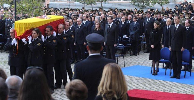 Los Reyes, don Felipe y doña Letizia, el presidente del Gobierno, Mariano Rajoy, y los líderes de los principales partidos políticos han acompañado a los familiares de los dos policías asesinados el pasado viernes en un atentado talibán en Afganistán en el funeral homenaje celebrado en el complejo policial de Canillas.