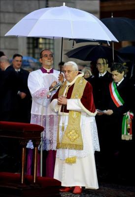 Desafiando a la lluvia, que durante todo el día cayó sobre Roma, el Pontífice, que vestía esclavina roja, llegó a la plaza romana en el «papa-móvil», siendo acogido por miles de personas, así como por las autoridades romanas y el embajador de España cerca de la Santa Sede, Francisco Vázquez.