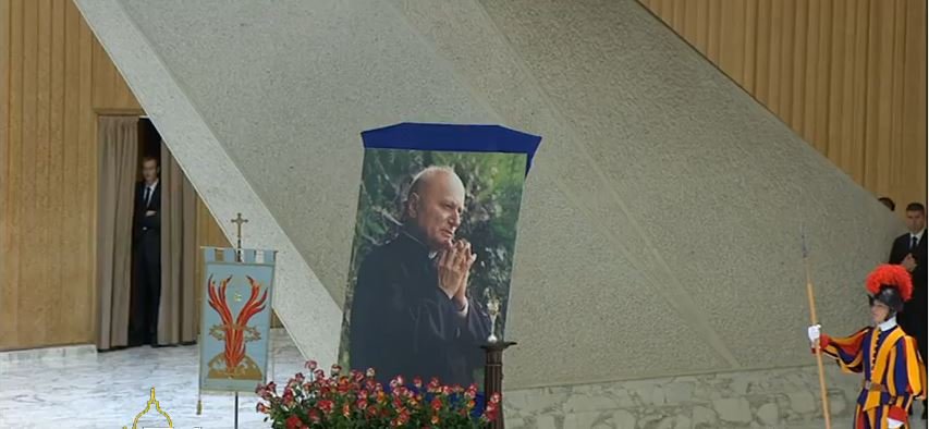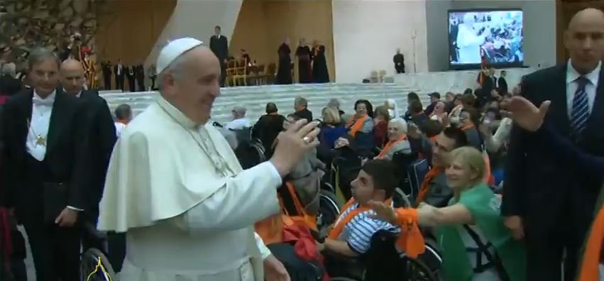 Francisco llegó al encuentro con más de media hora de retraso. En el aula Pablo VI, abarrotada de enfermos y de sus cuidadores, una gran foto del beato Luigi Novarese. Muchos de los enfermos, en sillas de rudas, ocupan una de las alas del aula. Todos con una bufanda color naranja.