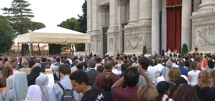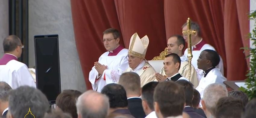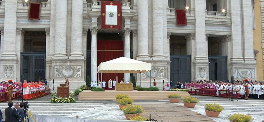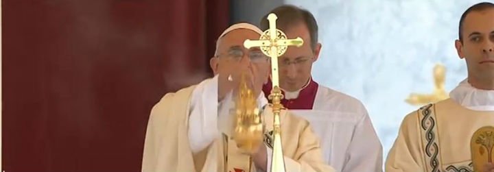 (José M. Vidal).- Se le ve en plena forma al Papa, celebrando la fiesta del Corpus en la esplanada de la Basílica de San Juan de Letrán. Y eso que, por prudencia y para conservar fuerzas de cara a su viaje del próximo sábado a Calabria, no asistirá a la posterior procesión. Concentrado y en oración, Francisco inicia la celebración de la eucaristía.