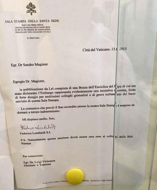 Magister, vaticanista de L’Expresso, fue sancionado hace seis meses con la retirada de su acreditación, después de saltarse el embargo a la encíclica papal «Laudato Si«, lo que fue considerado por la Santa Sede un «grave perjuicio del buen servicio de esta Sala de Prensza», según una carta enviada por Lombardi al periodista, en la que le comunicaba su castigo «de forma indefinido».