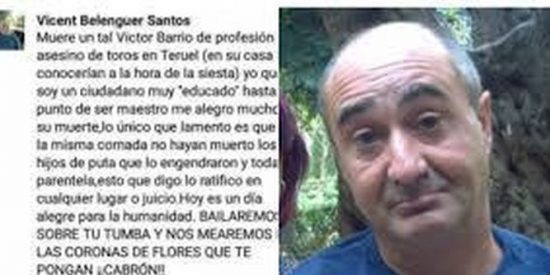 Entre las reacciones más polémicas y controvertidas a la muerte del torero en la plaza de Teruel destacó sin duda alguna la de un profesor valenciano de nombre Vicente Belenguer, cuyos comentarios macabros a todo Facebook provocaron un verdadero terremoto de rechazo a su alrededor.