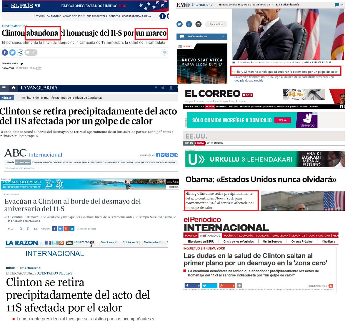 Nada, absolutamente nada de esto ha merecido la atención de los medios españoles hasta ahora. Y sin embargo, la salud de Clinton se ha convertido en una de las bazas fundamentales de los partidarios de su oponente Donald Trump o, si se quiere, de quienes no desean que Clinton resulte elegida. Sólo por esas razones la prensa española que «informa» (es un decir) sobre la competición presidencial en EE.UU. debiera haberse echo eco de estas circunstancias.
