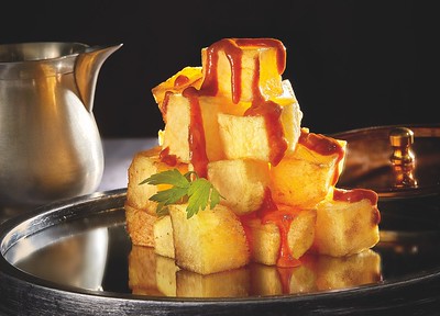 En este caso, la lección es bien sencilla. Cuando tengamos las patatas peladas y cortadas en cachelos, las cocemos durante 35 o 40 minutos para después templarlas en aceite de girasol a 170 °C sin que lleguen a coger un color muy dorado. A continuación, las sazonamos con sal en escamas y las servimos en una fuente a falta de nuestra salsa brava, que es lo más tradicional de esta elaboración. Para prepararla, fondeamos la cebolla y el ajo picado en un poco de aceite y añadimos la cayena, la pimienta en grano, el pimentón picante y el pimentón dulce. Seguidamente, incorporamos el pan para ligar la salsa y le añadimos agua hasta cubrirla. Después de turbinada y muy bien triturada, la pasamos por el colador chino, comprobamos su espesor, rectificamos el punto de sal si es necesario y ya está lista para napar esas patatas que hemos dejado en la fuente. Para los valientes y los amantes del picante, aconsejamos añadir un par de chiles habaneros a la cayena. Las podemos acompañar con chistorra, oreja o un simple ajo-perejil con un chorrito de vinagre. ¡Eso ya lo dejamos en tus manos!