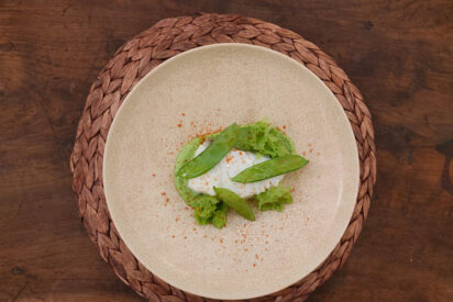 Bacalao confitado, crema de guisantes, bizcocho de perejil y tirabeques