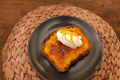 Torrija pan brioche, caramelizada, helado de leche merengada y naranja confitada