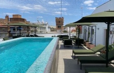 Aquitania Home Suites se ubica en un edificio de 1920 firmado por el arquitecto Aníbal González Álvarez-Ossorio, el mismo autor de la Plaza de España. Su rehabilitación ha respetado la esencia arquitectónica original mientras ha incorporado las últimas tendencias en diseño y confort. El resultado es un espacio cálido, elegante y adecuadamente preparado para estancias cortas o medias. Dispone de estudios, apartamentos y áticos totalmente equipados, todos con cocina, Smart TV LG®, climatización Daikin®, aislamiento acústico y térmico, amenities eco y, en algunos casos, terraza privada. ¿El broche final? Una azotea con piscina y vistas a la Giralda, adecuada para cerrar el día con una copa y el cielo de Sevilla como telón de fondo.