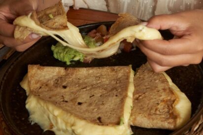 - Quesadilla: tortilla doblada y normalmente más grande, rellena —tradicionalmente— de queso y cocinada en plancha o comal.