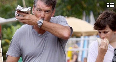 Sin cortarse un pelo. La imagen del matrimonio Brosnan engullendo se aleja mucho del concepto de glamour. No se puede obviar que el ex agente 007 y su adorada esposa se han puesto algo rollizos.