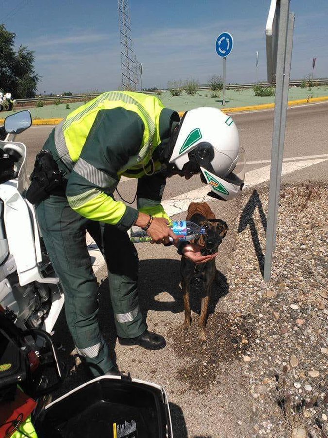 Por su aspecto parece un galgo famélico y, sobre todo sediento, bajo un sol abrasador. El agente ofrece su propia botella de agua para dar de beber al exhausto animal.