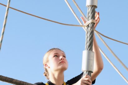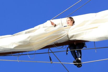 En las imágenes se aprecia a la princesa tirando de las cuerdas junto a sus compañeros, enfundada en un mono naranja fosforito —indispensable para protegerse del frío patagónico— o trepando por los mástiles con arnés y guantes. También aparece manejando un sextante, instrumento tradicional para orientarse en alta mar, demostrando que el aprendizaje práctico convive con las clases teóricas: navegación, astronomía, meteorología o historia naval son asignaturas obligatorias en este crucero de instrucción.