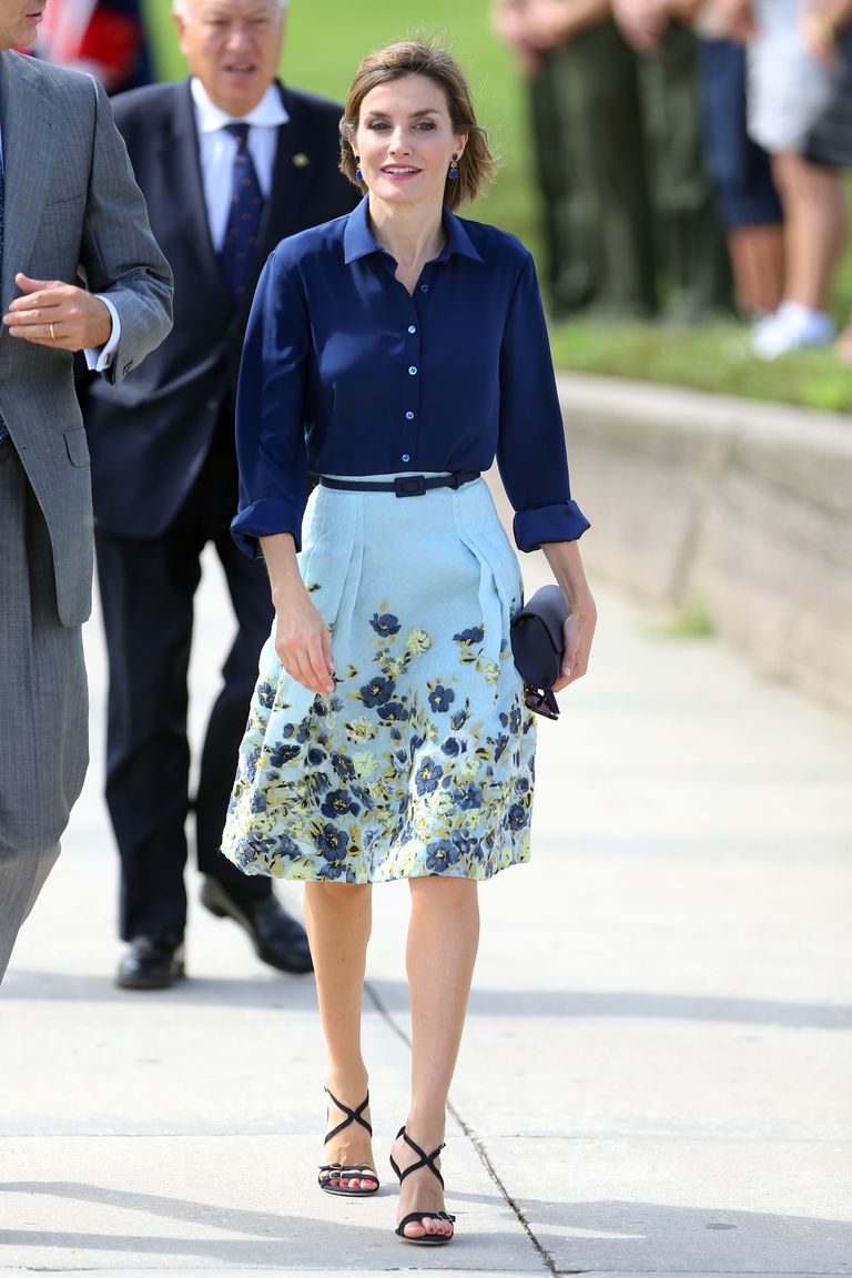 De hecho se ha remontado hasta mayo de 2015 y ha recuperado uno de sus conjuntos de Carolina Herrera favoritos. Lo estrenó hace cuatro años y desde entonces se lo ha puesto en varias ocasiones. Hablamos de esta combinación de camisa en tafetán azul marino y falda midi lady en azul cielo con flores en azul marino, amarillo y blanco. Ha recuperado el estilismo tal cual porque hasta el cinturón lo ha mantenido a lo largo de los años. Lo que si ha cambiado es su elección de complementos, apostando esta vez por unos salones y un bolso de mano, ambos en azul oscuro siguiendo la línea de color.