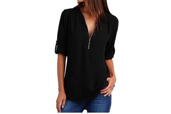 Lo bueno del negro es que combina con todo y además estiliza. Esta blusa negra con cierre de cremallera en la parte del pecho y mangas a la altura del codo, la tienes en siete colores. ¡Seguro que pensarás en llevarte más de uno cuando veas el precio porque también ronda los 5 €!
