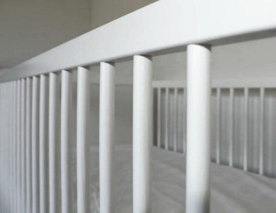 Cuna con opción a colecho gracias a su sistema de barandilla abatible. Fabricada en madera de haya procedente de bosques sostenibles y lacada en color blanco.