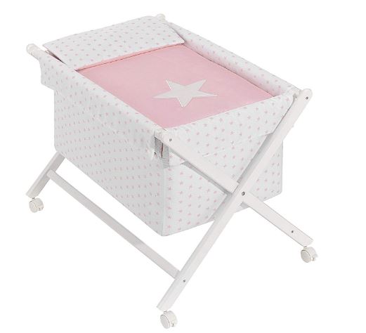 - Minicuna equipada con vestiduras de algodón 100%.