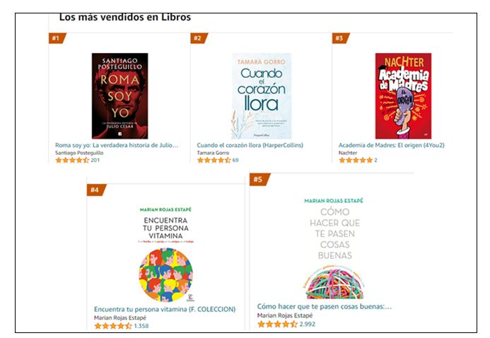 Entre los libros más vendidos de Amazon 2022 destacan autores españoles: como Santiago Posteguillo, autor de ‘Roma soy yo: la verdadera historia de Julio César’, o los libros de autoayuda de la médico psiquiatra María Rojas Estapé como ‘Encuentra a tu persona vitamina’ o ‘Cómo hacer que te pasen cosas buenas’.