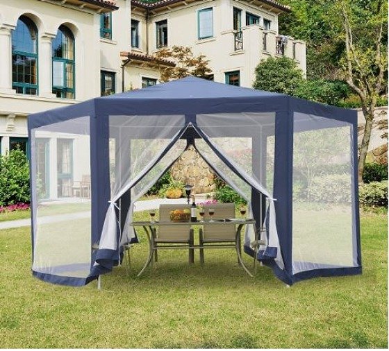 Pérgola de acero hexagonal con mosquitera - Material de Poliéster Repelente al Agua (Azul)φ3.9m