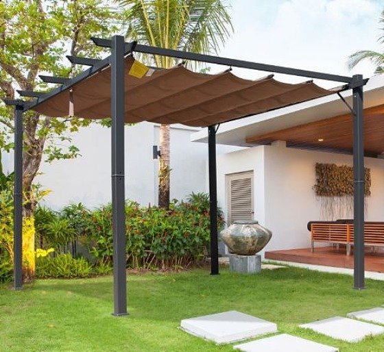 - Pérgola con diseño moderno ideal para jardín, tiene un toldo corredizo regulable y retráctil, se puede bajar y subir gracias a las asas integradas.