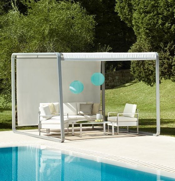 Pérgola gazebo minimalista con estructura de acero y cubierta de tela.