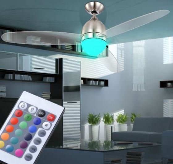 Ventilador con aspas de colores y lámpara compatible con bombillas LED.