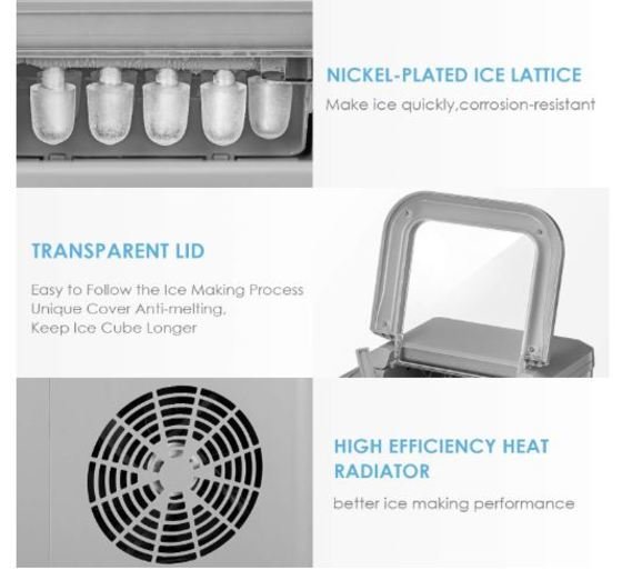 Máquina de cubitos con deposito de 3 litros y dos tamaños de cubitos. En unos 13 minutos produce unos 9 cubitos.