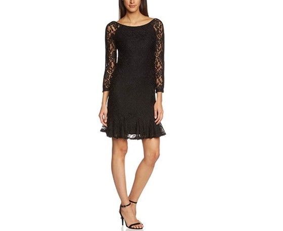 - Escote y mangas de encaje en contraste con el resto del vestido en negro liso.